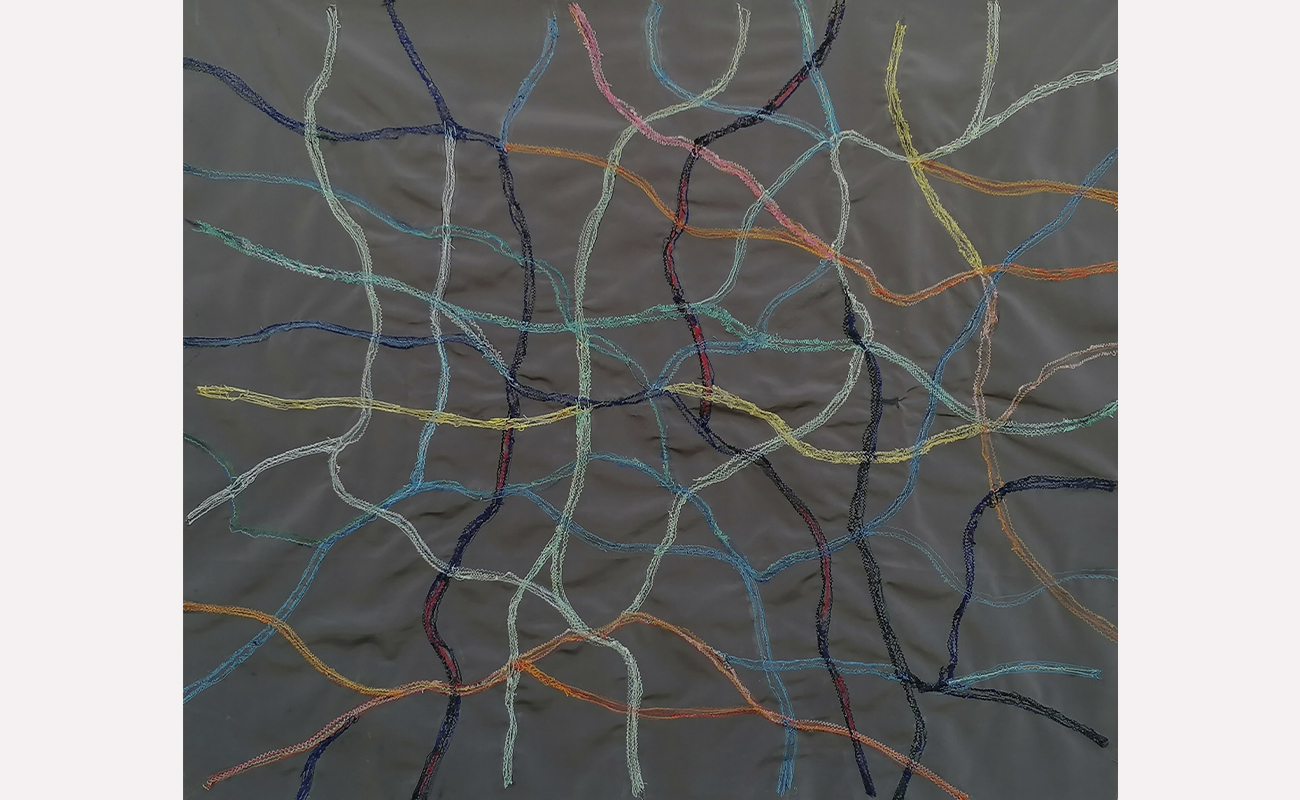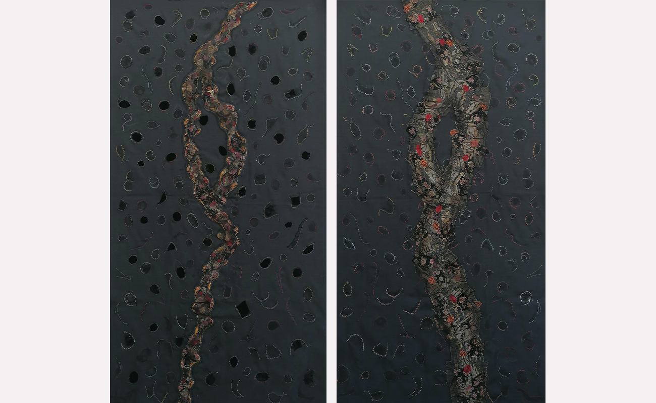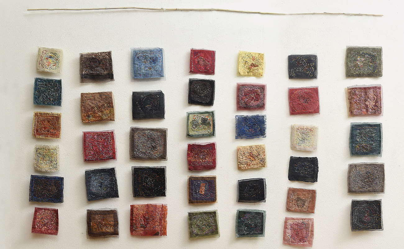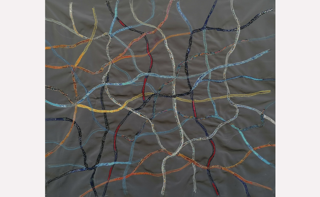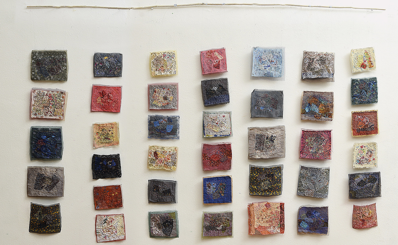 Τα έργα αυτής της ενότητας σε αφήνουν να τα δεις από δύο θέσεις: από μπροστά είναι η καλή τους πλευρά, από πίσω η ανάποδη. Είναι υφάσματα που έχουν πάνω τους άλλα μικρότερα κομμάτια υφάσματος, ραμμένα στο χέρι με πολλές βελονιές που δημιουργούν δίχτυα, χάρτες, συνδέσεις κυττάρων. Ήταν και για μένα αποκαλυπτικό· καθώς δούλευα πάνω στη μία πλευρά της υφασμάτινης επιφάνειας με όλη την επιμέλεια και προσοχή να βγουν οι τονικότητες και οι υλικές υφές για να βγει η σύνθεση που είχα στο νου μου, και όταν αυτή ολοκληρώθηκε και αντίκρισα την ανάποδη όψη, είδα τότε ένα άλλο έργο, που είχε ολοκληρωθεί ερήμην μου. Όσο δούλευα τη μια πλευρά, μια άλλη όψη φτιαχνόταν· η μία προσεγμένη, ζυγισμένη, η άλλη με «τυχαία» πρωτόγονη ελευθερία. Σχέση συνειδητού-ασυνείδητου, ηθελημένου-αθέλητου· συνομιλία δύο κόσμων για το Όλον.