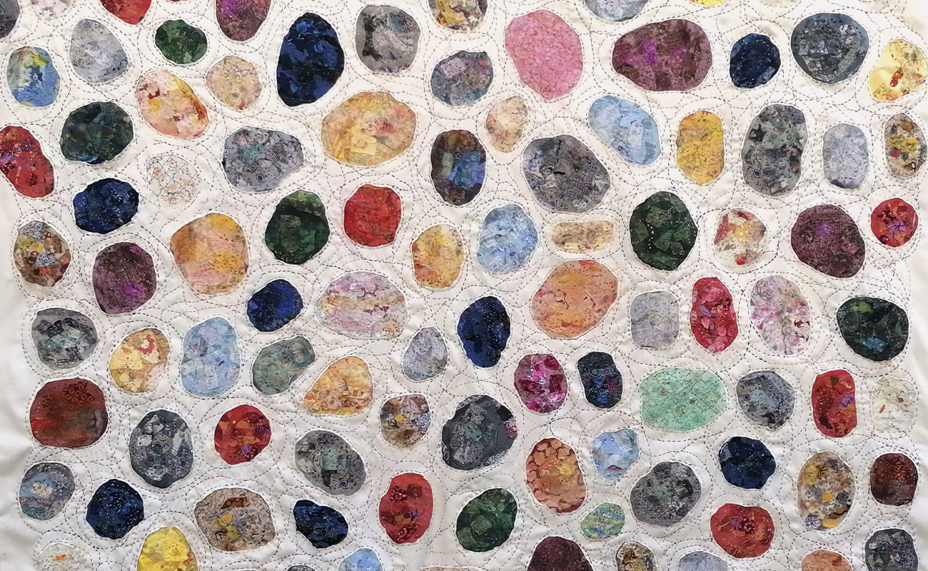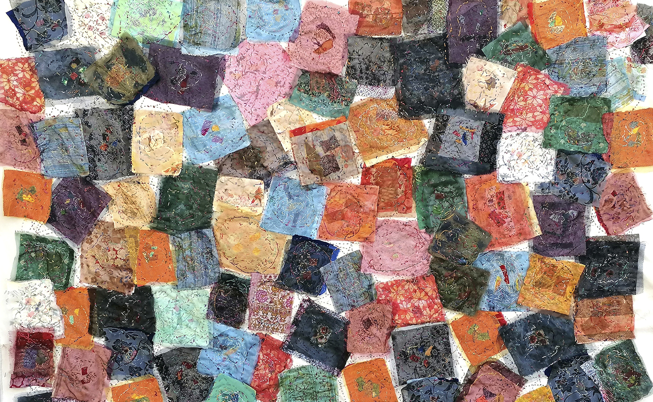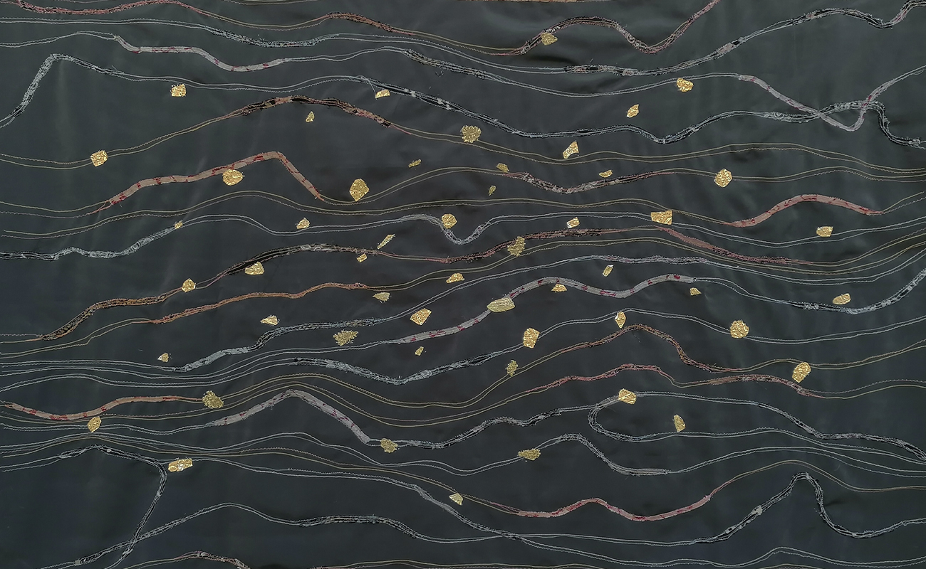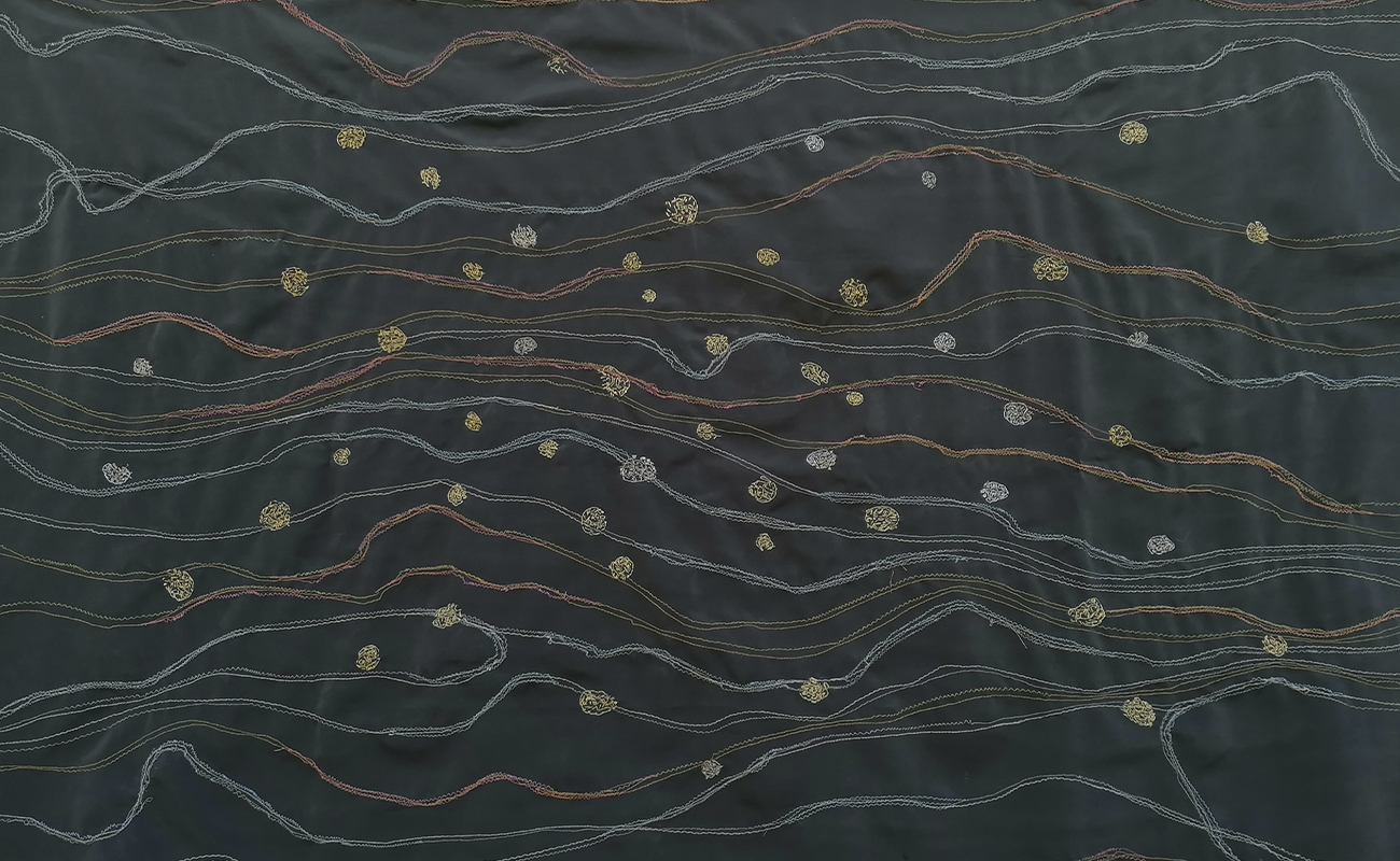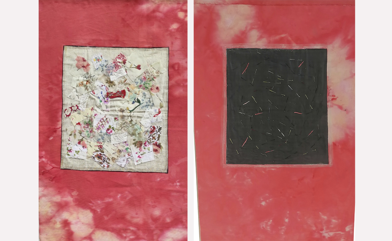 Τα έργα αυτής της ενότητας σε αφήνουν να τα δεις από δύο θέσεις: από μπροστά είναι η καλή τους πλευρά, από πίσω η ανάποδη. Είναι υφάσματα που έχουν πάνω τους άλλα μικρότερα κομμάτια υφάσματος, ραμμένα στο χέρι με πολλές βελονιές που δημιουργούν δίχτυα, χάρτες, συνδέσεις κυττάρων. Ήταν και για μένα αποκαλυπτικό· καθώς δούλευα πάνω στη μία πλευρά της υφασμάτινης επιφάνειας με όλη την επιμέλεια και προσοχή να βγουν οι τονικότητες και οι υλικές υφές για να βγει η σύνθεση που είχα στο νου μου, και όταν αυτή ολοκληρώθηκε και αντίκρισα την ανάποδη όψη, είδα τότε ένα άλλο έργο, που είχε ολοκληρωθεί ερήμην μου. Όσο δούλευα τη μια πλευρά, μια άλλη όψη φτιαχνόταν· η μία προσεγμένη, ζυγισμένη, η άλλη με «τυχαία» πρωτόγονη ελευθερία. Σχέση συνειδητού-ασυνείδητου, ηθελημένου-αθέλητου· συνομιλία δύο κόσμων για το Όλον.