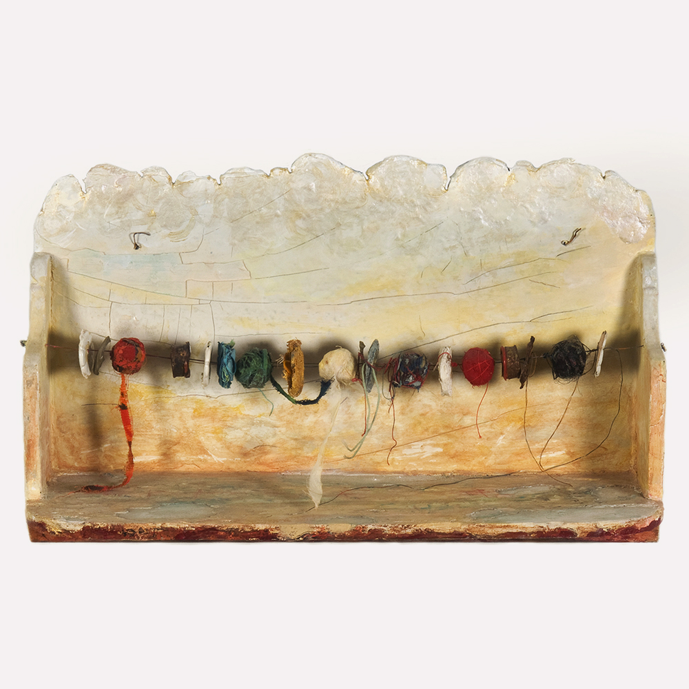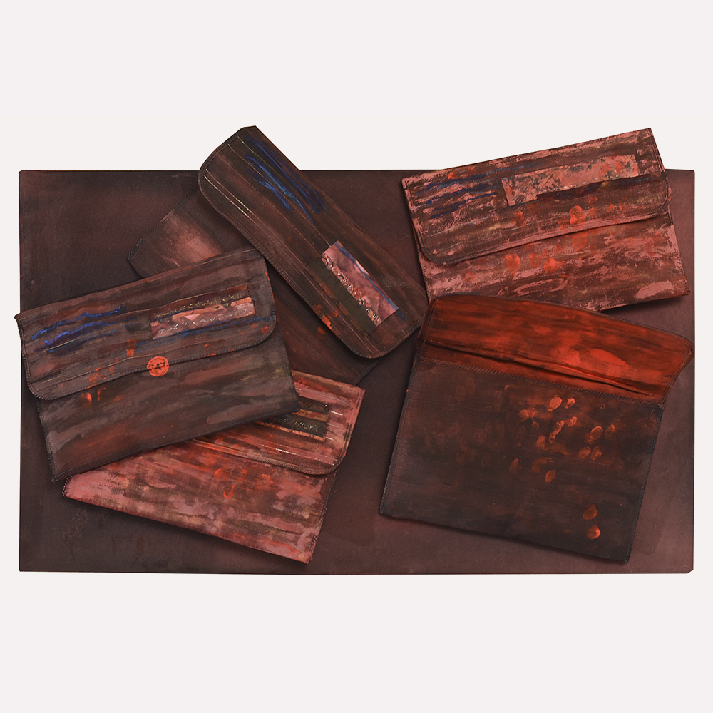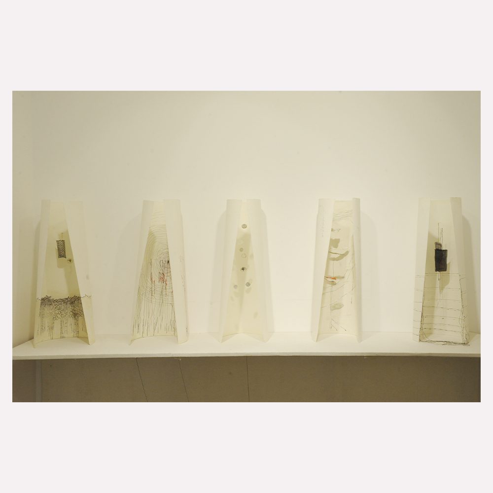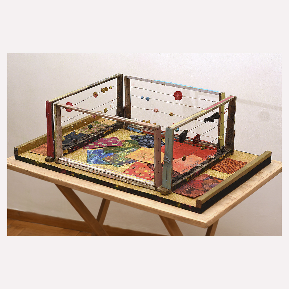 Τα έργα είναι φτιαγμένα από ύφασμα, ξύλο, σύρμα, χαρτί, κλωστές και χρώμα.
