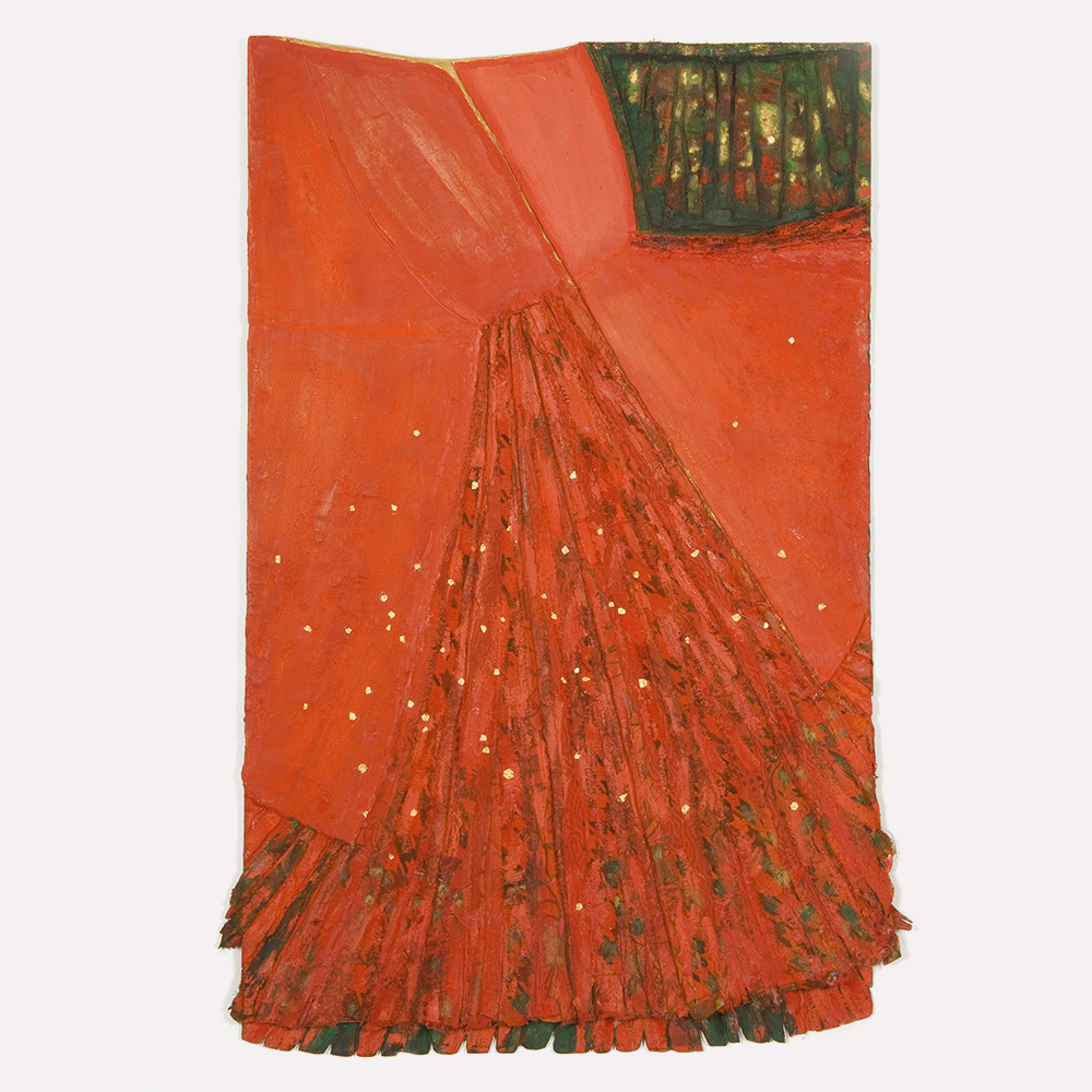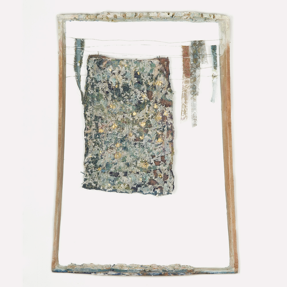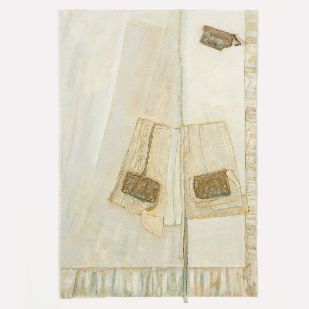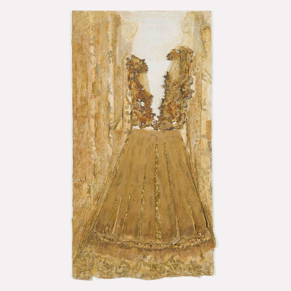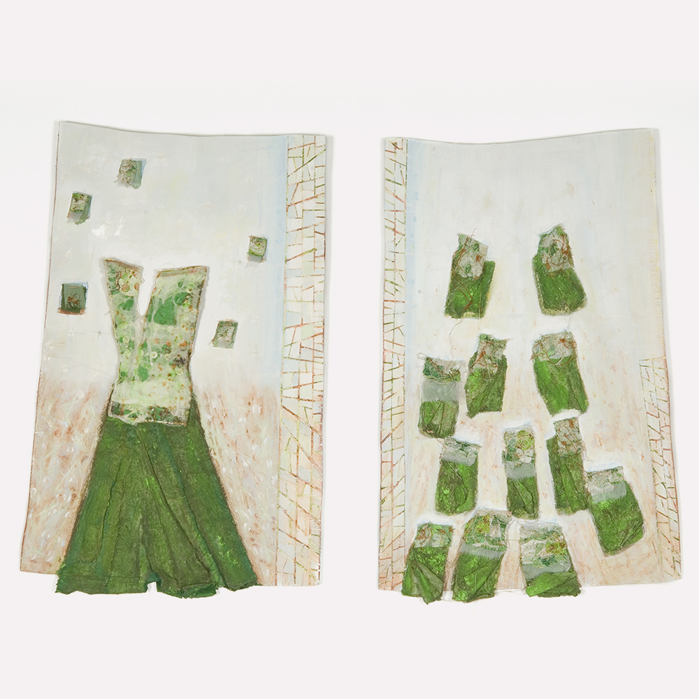 Τα διπλωμένα τόπια γίνονται ενδύματα και μετά απλώνονται στον χώρο. Οι επιφάνειες είναι γεμάτες σκαψίματα, χαρακιές, λιωμένο κερί. Μαζί με το ύφασμα, το χαρτί και το χρώμα έχουμε μια συνομιλία πληγής, πόνου και χαράς. Το ρούχο είναι κρεμασμένο στον «χρόνο» χωρίς το σώμα που το φορά· φέρει όμως το αποτύπωμά του.