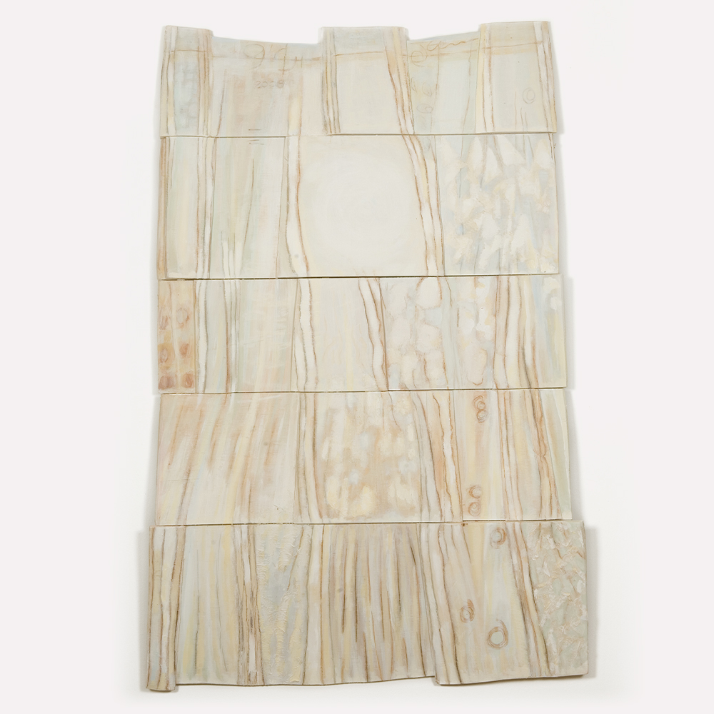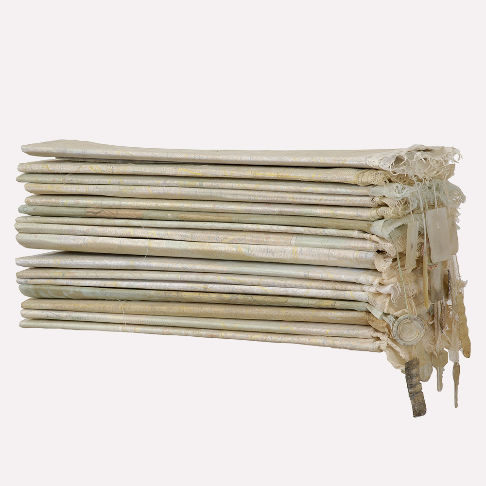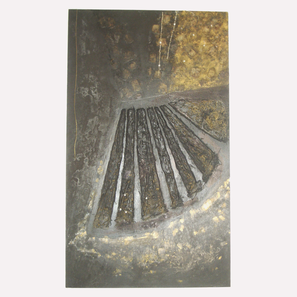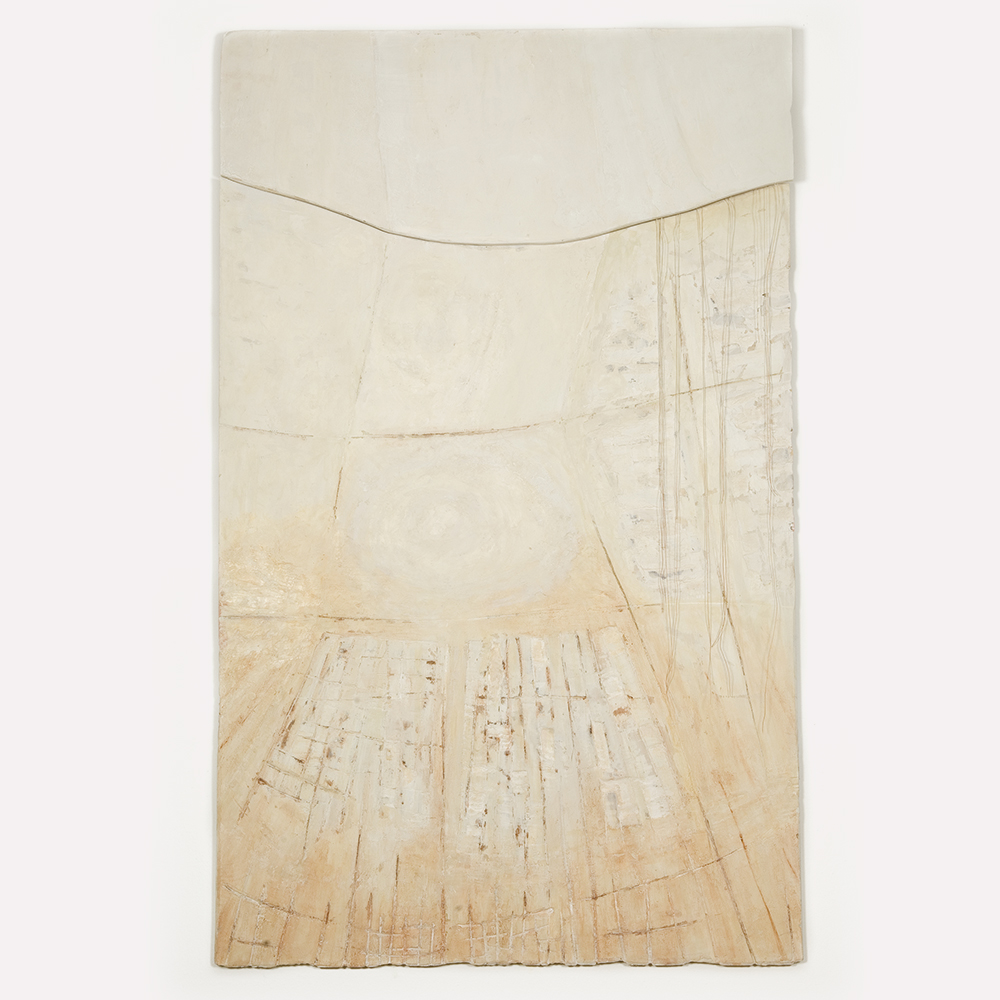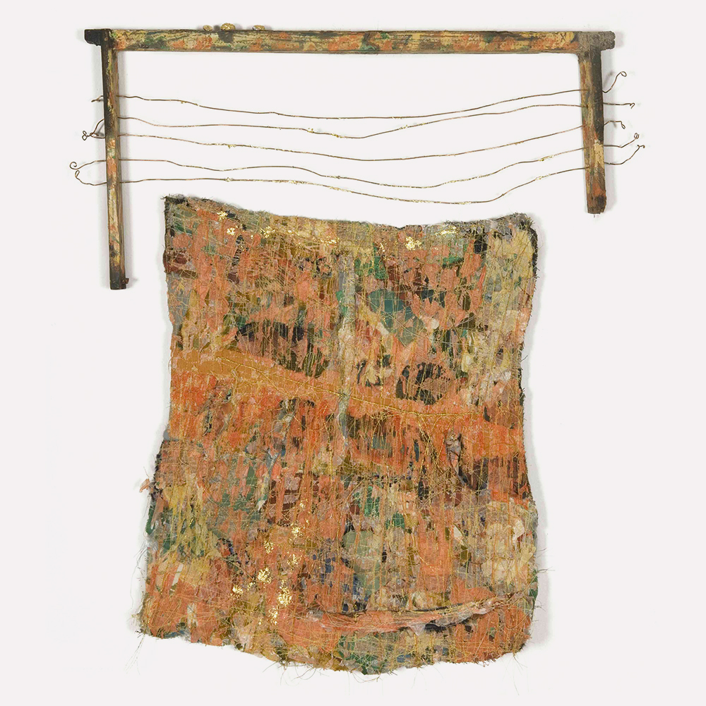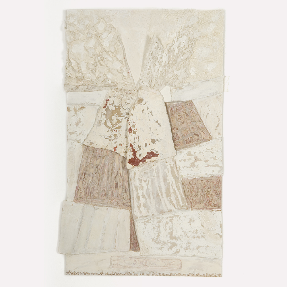 Τα διπλωμένα τόπια γίνονται ενδύματα και μετά απλώνονται στον χώρο. Οι επιφάνειες είναι γεμάτες σκαψίματα, χαρακιές, λιωμένο κερί. Μαζί με το ύφασμα, το χαρτί και το χρώμα έχουμε μια συνομιλία πληγής, πόνου και χαράς. Το ρούχο είναι κρεμασμένο στον «χρόνο» χωρίς το σώμα που το φορά· φέρει όμως το αποτύπωμά του.